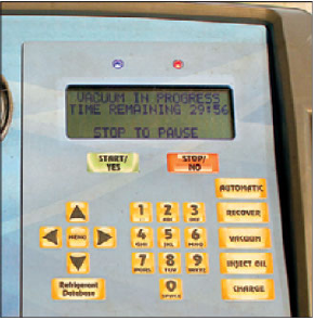 The AC recovery/recharging machine has a built-in electric vacuum pump that pulls an excellent vacuum on the system without having to connect external hoses or manifolds. Pulling a vacuum on the AC system prior to recharging it with refrigerant is necessary to remove all of the moisture from the system.