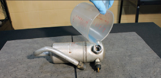 Refrigerant oil should be added to the accumulator dryer prior to installing it on the vehicle. It is important to make sure the correct viscosity and type of oil is used in each AC system to prevent the wrong oil from being installed into the