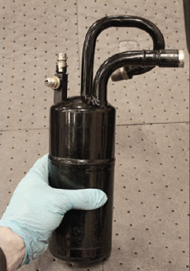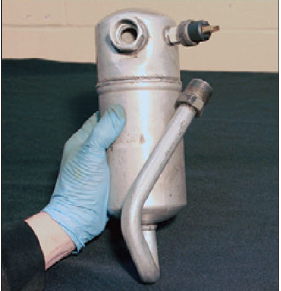 It is important to remember to install the accumulator dryer as the last step when making an extensive AC system repair because the dryer contains a desiccant that will absorb moisture as soon as it is uncapped from shipment. Another key point to remember is to add about 1 ounce of refrigerant oil to the device prior to installing it on the vehicle.
