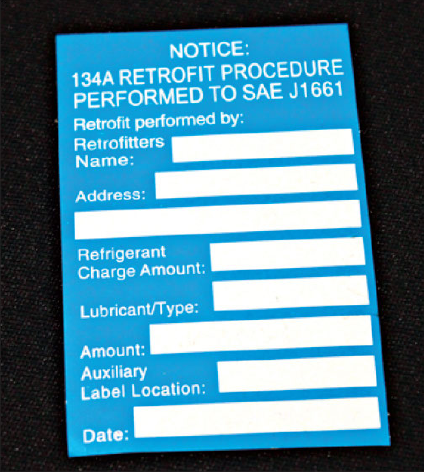 The retrofit decal must be installed in a conspicuous location prior to putting a retrofitted vehicle back into service. The decal provides important information about the AC system for anyone who may service the system in the