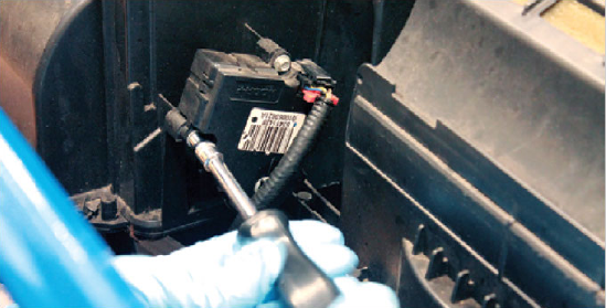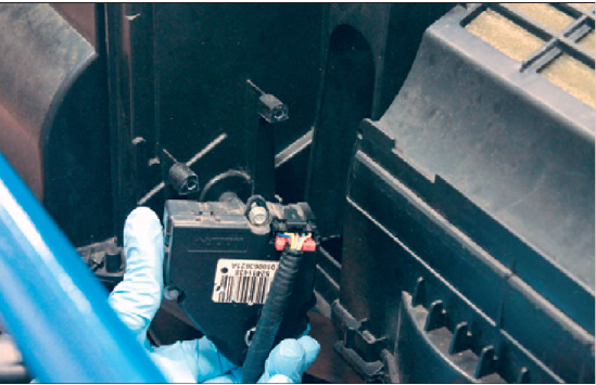 The temperature control electric actuator is being removed to inspect the temperature door during diagnosis. This actuator is held in place with three small
