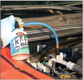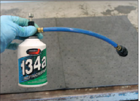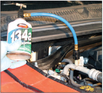 3. Open the valve on the charge hose to allow refrigerant to move from the can into the vehicle. duct temperatures cool to a normal range.