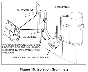 Posted on July 27, 2022 by Jack Lennox XC25 – INSTALLING ISOLATION GROMMETS Locate the isolation grommets (provided). Slide grommets onto vapor and liquid lines. Insert grommets into piping panel to isolate refrigerant lines from sheet metal edges.