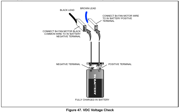 2. Voltage present – Perform a 9-volt battery test on motor (see figure 47).