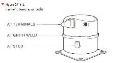 If a leak exists at the electrical terminals of a hermetic compressor (Figure SP-9-5), it cannot be repaired and the compressor must be replaced. If a leak exists at the girth weld or at the stubs, recover all refrigerant and repair the leak with silver brazing alloy. If the leak cannot be repaired, replace the compressor.