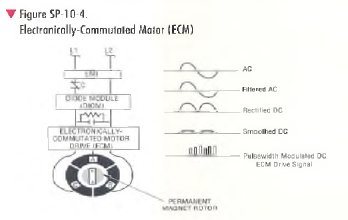 Electronically -Commutated Motors — Electronically – commutated motors (ECMs) are variable-speed, high-efficiency motors. These motors can vary their speed based on predetermined control instructions programmed into a built-in microprocessor. Typically, they are programmed to provide the speed needed to provide a constant airflow based on system requirements. The use of ECMs in HVAC equipment is rapidly increasing. They are typically used in the same applications where conventional shaded-pole and P SC motors are used, such as fan motors and draft inducer motors in high-efficiency furnaces. In the same application, ECMs tend to operate with a 60% to 75% energy savings over conventional motors. A brief description of ECM motor operation is given here.