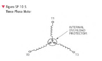 Three-Phase Motors — Three-phase motors are generally used when the motor requirements are greater than 7 HP or higher starting torque is required. All three-phase motors have at least three internal windings of equal resistance and the same number of wire turns. Three-phase motors have good starting and running characteristics and higher running efficiency. Unlike single-phase motors, three-phase motors (Figure SP-10-5) require no external starting relays or capacitors. Multi-speed three-phase motors are seldom used in residential or light commercial equipment.