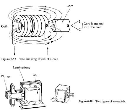 A solenoid is a device that uses these principles. A helical coil of wire produces a magnetic field. An iron core fits loosely within the coil of wire. When the current is off, the core rests outside the area of the coil. When the current is applied, the core is sucked into the coil. This is referred to as the sucking effect of a coil (see Fig. 6-17).